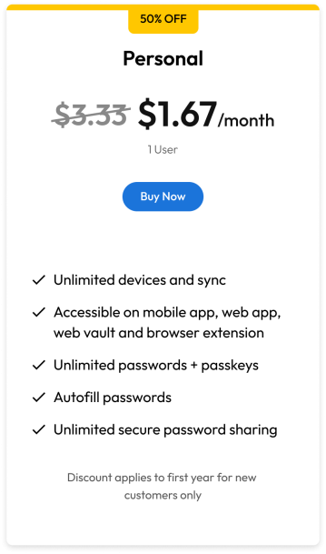 Easily create and store your passwords and passkeys with a secure personal password vault that you can access from your phone, computer or any other device.